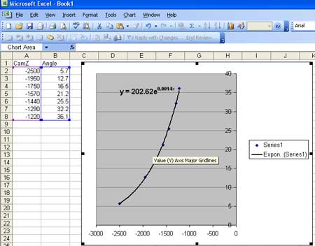 I was building a 3D application. I had a camera and needed it’s X rotation to be close to certain values depending on the camera’s position on the Z axis. I manually moved the camera into position and noted down samples of the values I required and placed them into Excel: One column for the z value and one for the required angle. – I only need a handful of samples to allow me to plot a regression trend line.
