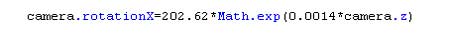 As required, I have calculated the formula using the camera.z value and applied it to camera.rotationX. Now whenever the z value changes I have a smooth curve applied to rotationX.